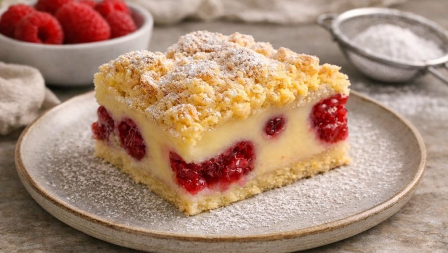 KOLAČ SA MALINAMA, PUDINGOM OD VANILE I PRHKIM MRVICAMA: Slatkiš za pamćenje